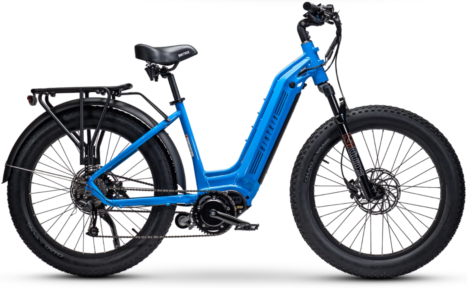 Juggernaut XD Duo Step-Thru – L | 18” Frame (Fits Riders 5’10”+ / 32”+ inseam) / Azure Blue / 27.5×3 MTB Wheels (great on pavement | groomed trails)